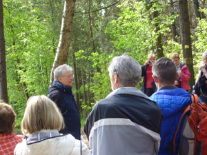 OWV-Vorsitzender Erwin Mayer lud sodann zur Wanderung auf dem Pfaffensteig, der von unserem Zweigverein in den vergangenen Wochen neu ausgeschildert wurde, ein. Viele Jahrhunderte wurde dieser Weg, – wie Toni Jäger berichtete – nicht nur vom Pfarrer, sondern von unzählig vielen Menschen begangen. Die Wanderer kamen am Pfaffensteig auch am „13. Stein“ vorbei, der gut 400 Jahre überlebt hat und vermutlich im Original erhalten blieb. Bald wurde Prissath erreicht und durch die Straßen Fronbergs gings zur Schloßkapelle in Fronberg. Dort trug Erwin Mayer den vielen Wanderern Wissenswertes über die Schloßkapelle vor. Die Wanderer kamen zum Abschluss noch in der Brauereiwirtschaft zur gemeinsamen Brotzeit zusammen.